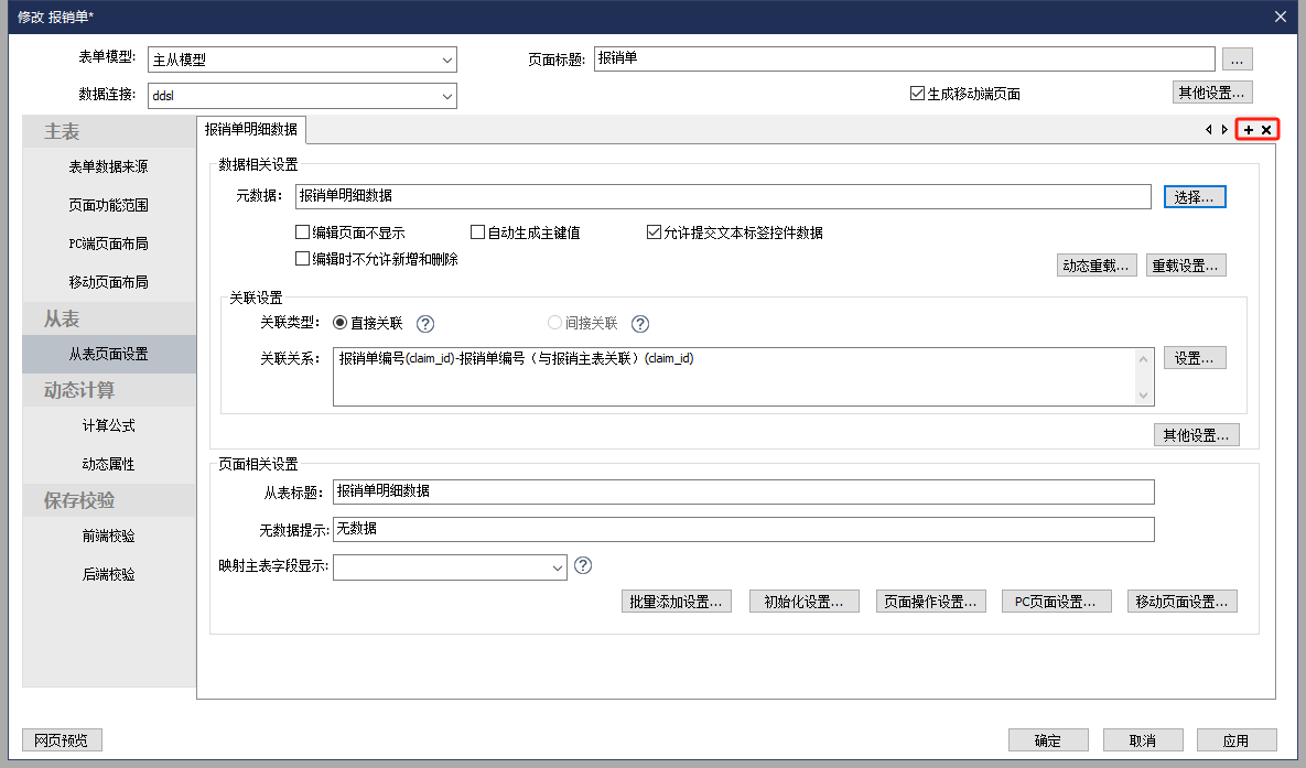 主从模型与单表模型相比,差异点自然是多了从表的配置。首先需要在【从表页面设置】节点通过右上角的“+”操作添加一个从表,也可以通过“×”删除不需要的从表。添加从表以后需要选择对应的元数据如下图,本例中我们选择了准备好的元数据“报销单明细数据”。