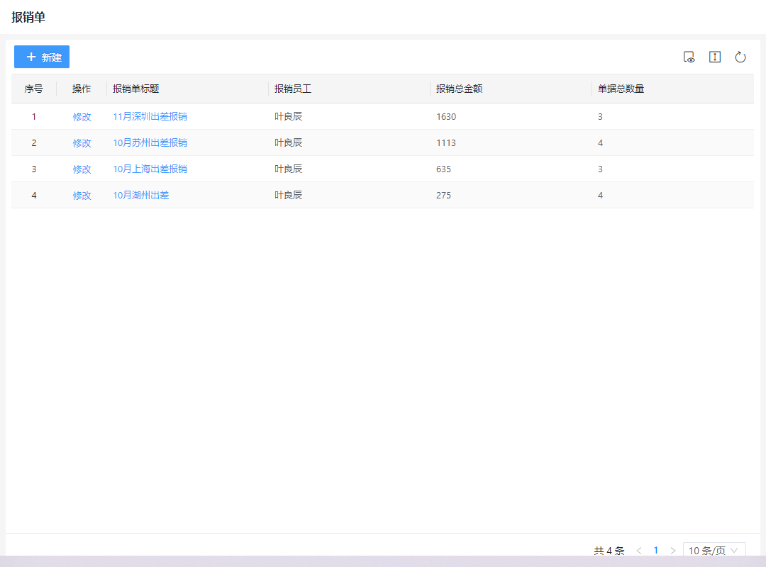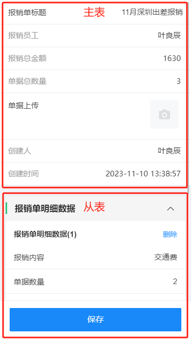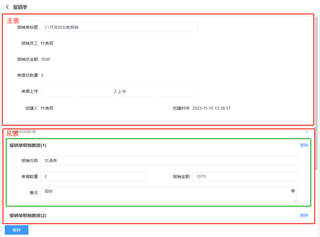 主从模型可以在填报时在主表数据的基础上还可以填报一些其他与主表相关联的数据,同时回写多张表的数据。例如报销业务就是较为典型的主从应用,往往一张报销单的基础信息会作为主表,用于填报如报销人、总金额和单据总数等,主表数据让财务审核人员一眼就能看到这条报销的整体情况,此外还需要在从表中填写这条报销记录相关的明细数据如用途、金额、报销单据等字段信息供财务人员核对。