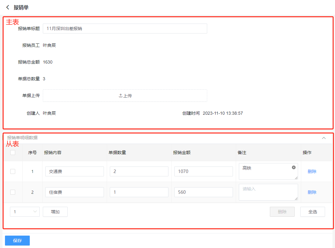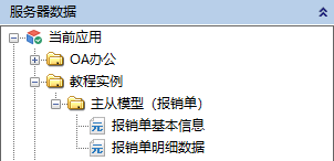主从模型需要提前准备好主表和从表的元数据,例如本案例中如下图所示准备了主表元数据“报销单基本信息”,以及从表元数据“报销单明细数据”。