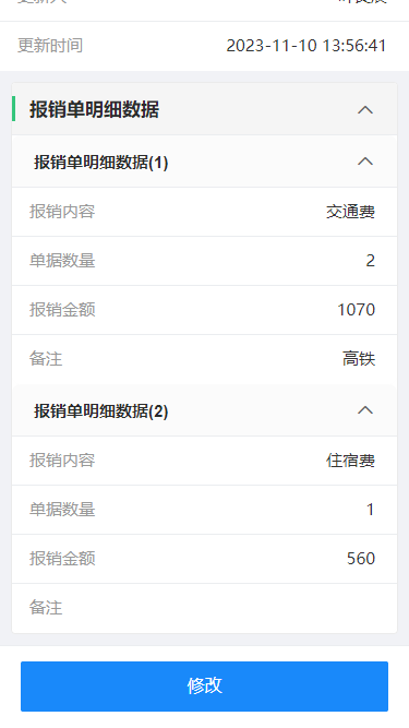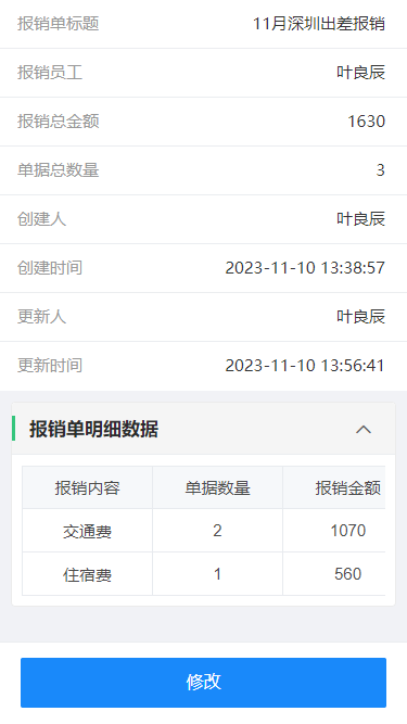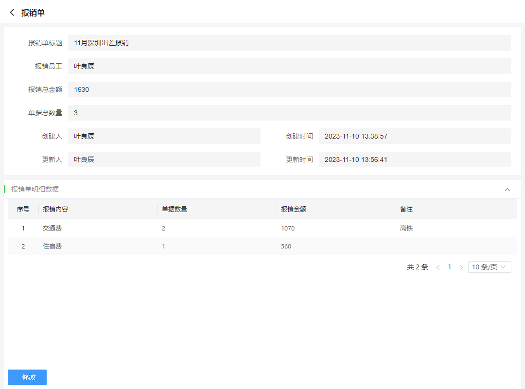 详情页面:常规配置下按“主-从”布局展示,允许配置【修改】按钮进入修改页面对数据进行修改。