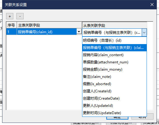 可以在【关联设置】中配置主表和从表的关联字段,本例中我们在从表中有一个报销单编号字段用于存储主表的报销单表编号,因此这里就将这两个字段作为主从表的关联关系字段。
