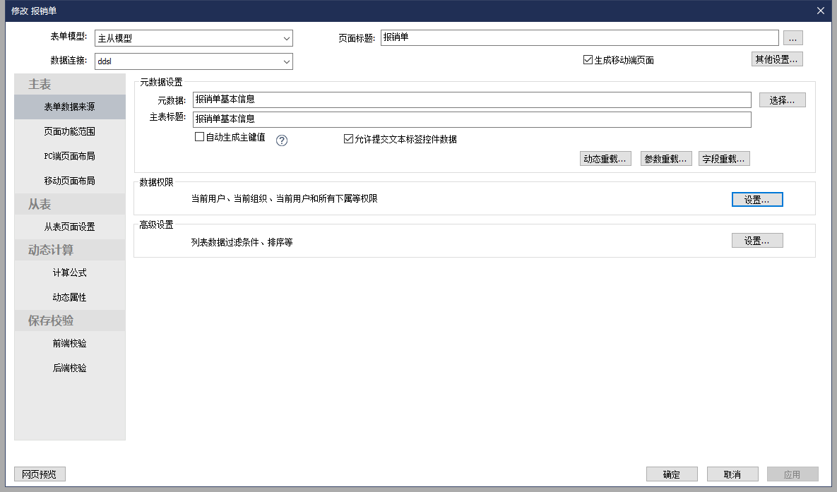 在模版中创建一个跨设备表单,在表单模型下拉框中选择“主从模型”,设置页面标题,选择对应数据源的数据连接,然后主表的配置方式与单表模型配置类似,最重要的就是选择主表元数据,本例中我们选择对应的元数据”报销单基本信息”。