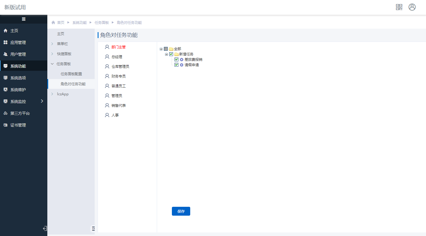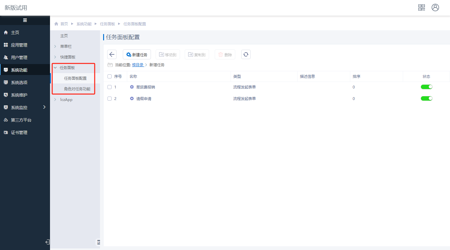 这里的配置需要系统管理员登录乐创者门户lczPortal,在菜单“系统功能>任务面板”中可以看到两个菜单:“任务面板配置”和“角色对任务功能”。