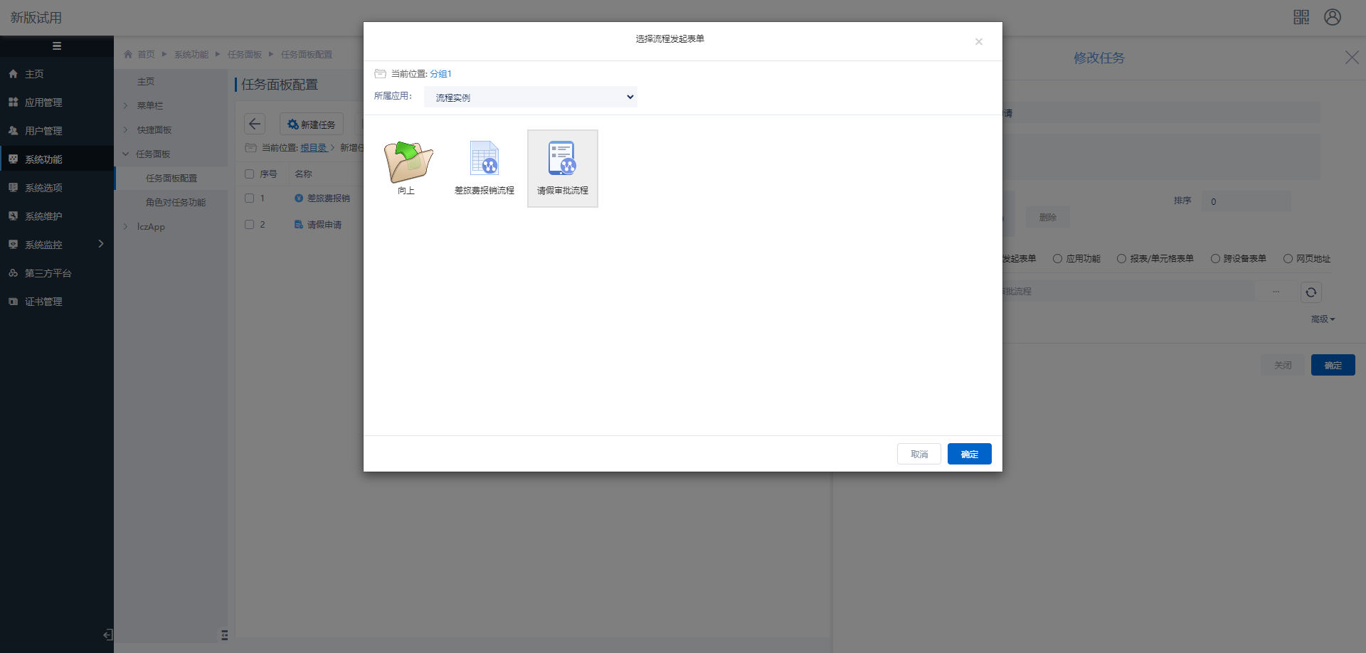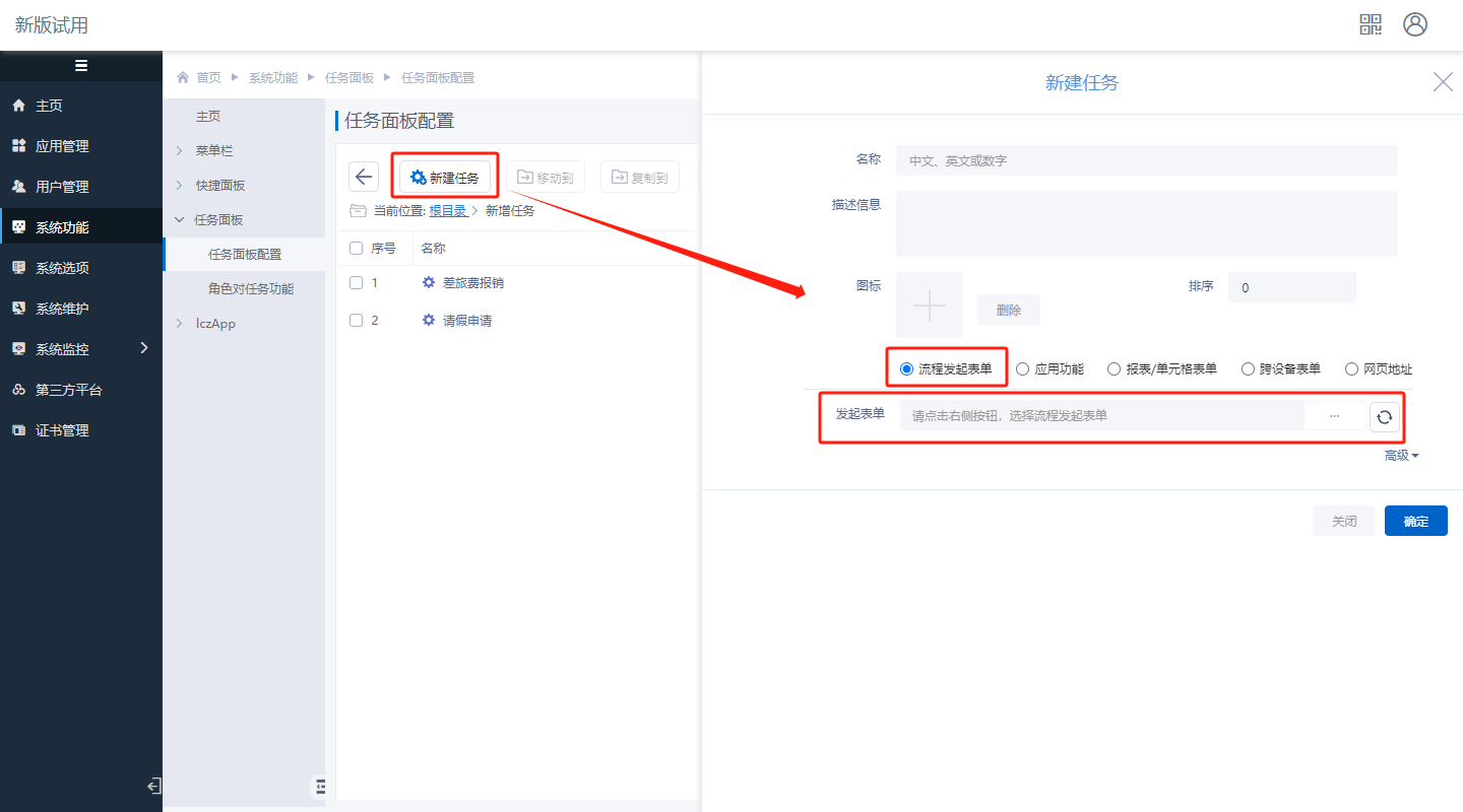 单击【新建任务】在弹窗中可以配置任务的名称、图标等,关联的文件选择“流程发起表单”。