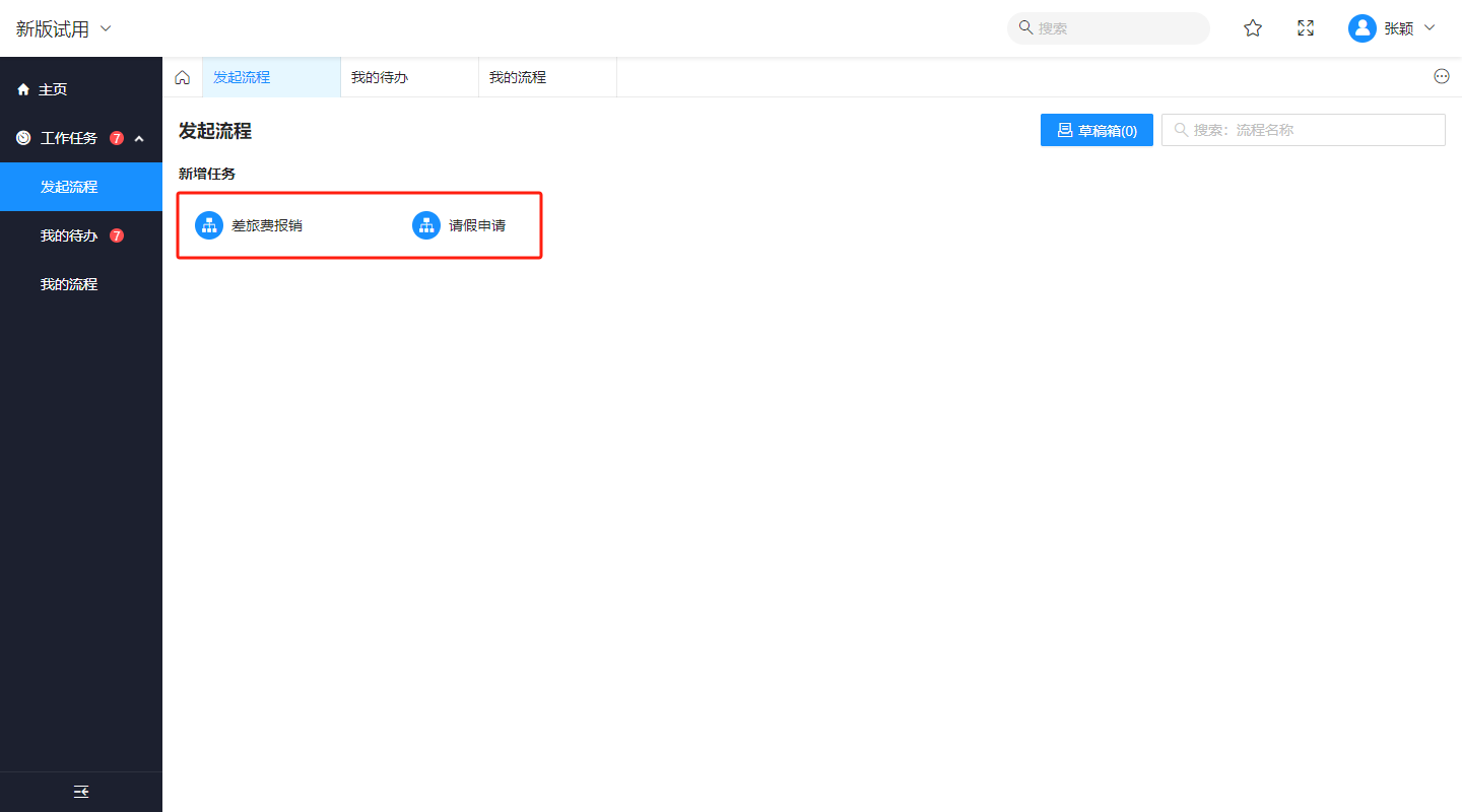 乐创者为工作流的操作专门提供了“任务面板”功能,包含了“发起流程”、“我的待办”和“我的流程”三个模块,用于操作流程的发起、审批和查看等。