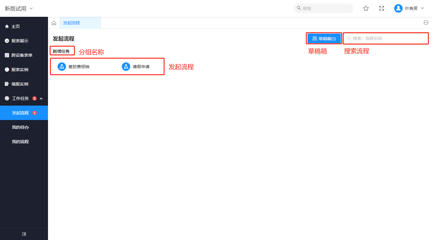 单击对应的发起流程面板就可以进入到流程发起表单进行填报,例如单击“请假申请”。