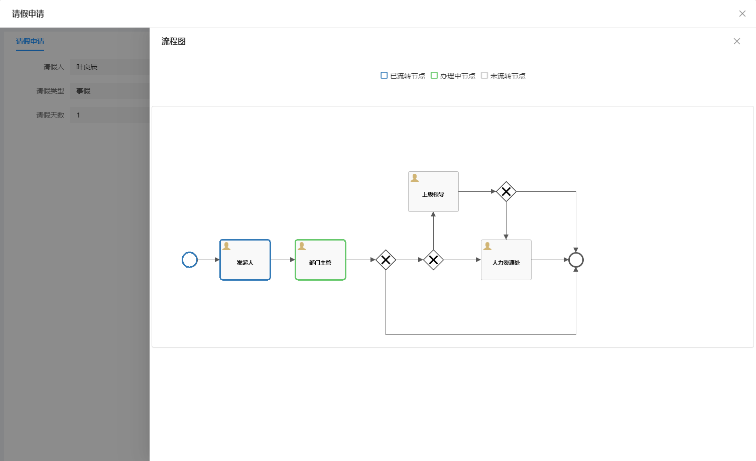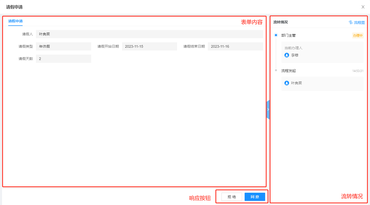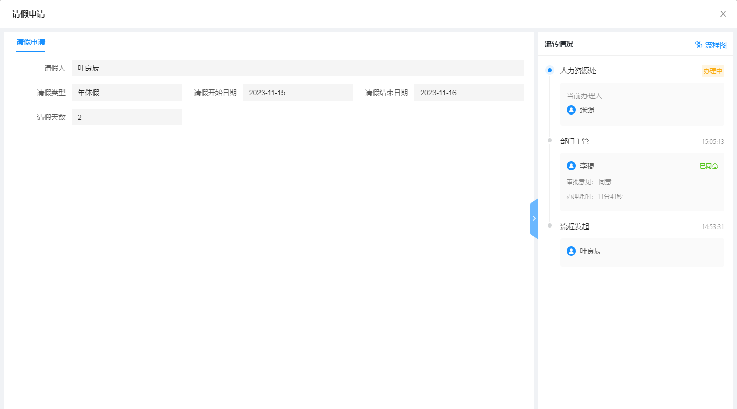 流程详情查看不涉及任何操作,可以查看流程内容和实时流转情况。