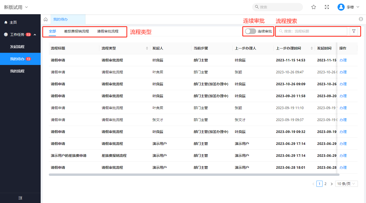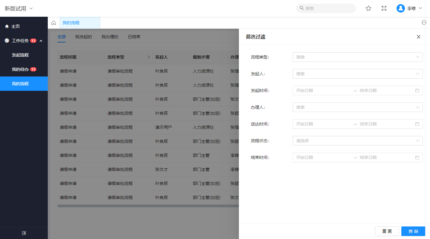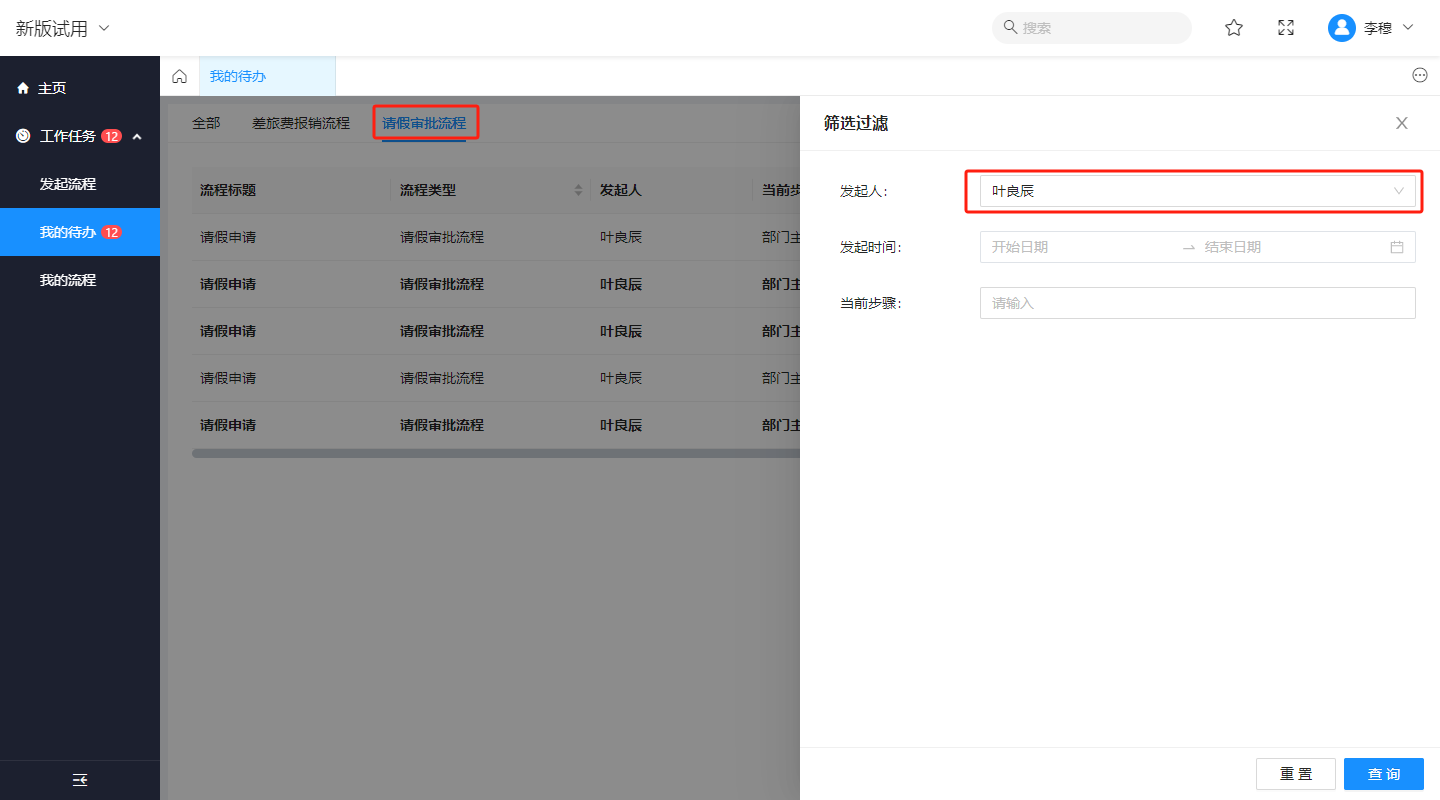 支持按流程类型和其他流程相关过滤条件对数量较多的流程进行快速过滤以提高审批效率,例如筛选出发起人为“叶良辰”的全部请假审批流程,如下图所示。