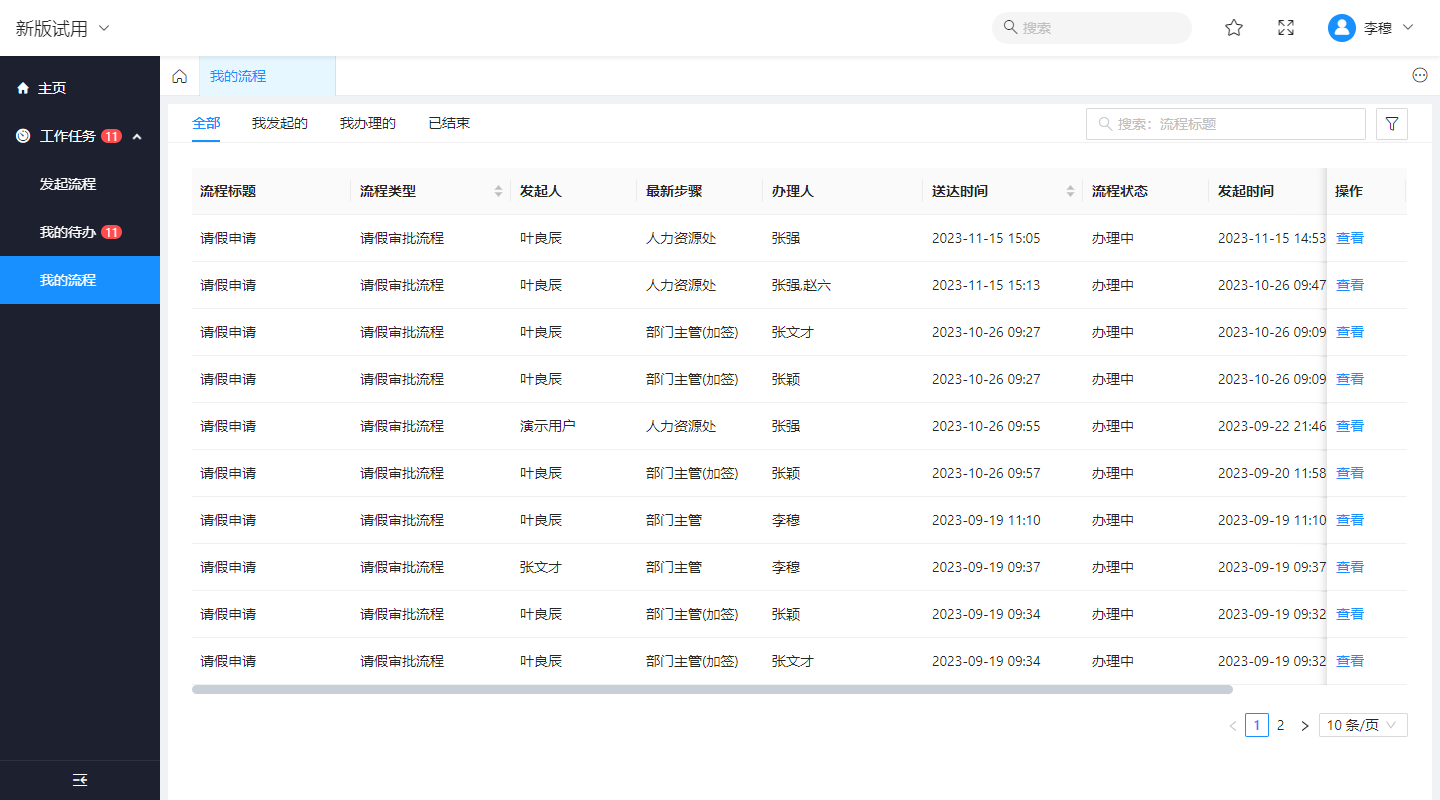 我的流程界面如下,主要提供与“我”相关的流程查询和查看,包含“我发起的”和“我办理的”。