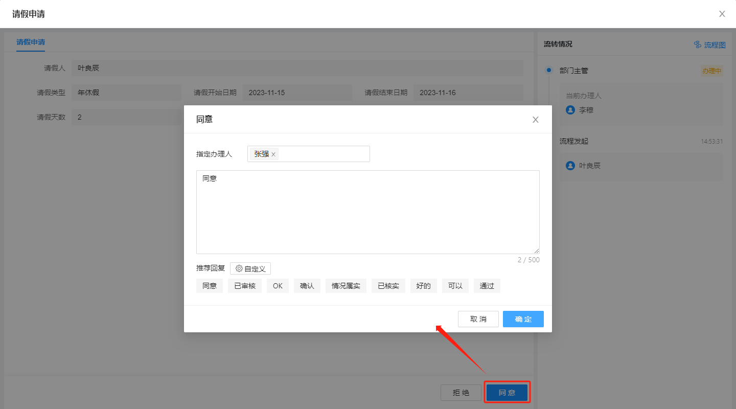 通过“响应按钮”提交对当前流程的审批意见即可完成办理,例如选择“同意”。