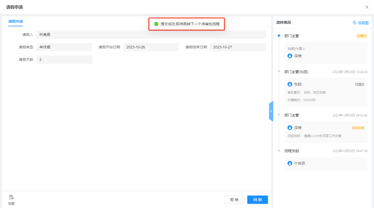 提交后跳转“流程审批完成”界面,在此界面可以手动继续审批下一条或去查看刚刚审批的这条流程的详情。
