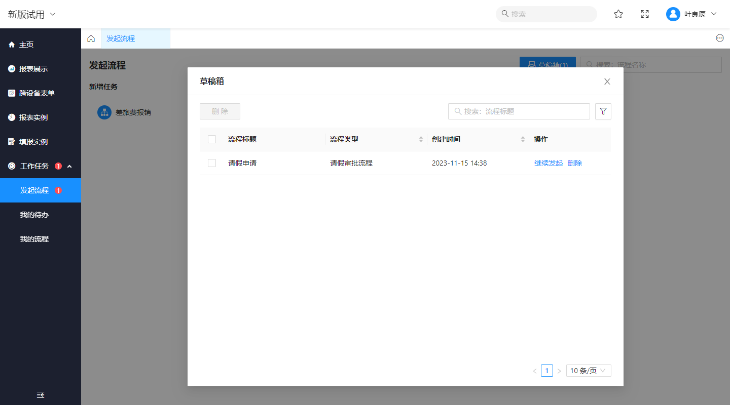 在草稿箱中可以看到表单的创建时间,可以在这里对其进行继续发起或删除操作。