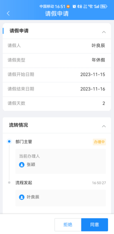 单击对应的发起流程面板就可以进入到流程发起表单进行填报,例如单击“请假申请”。