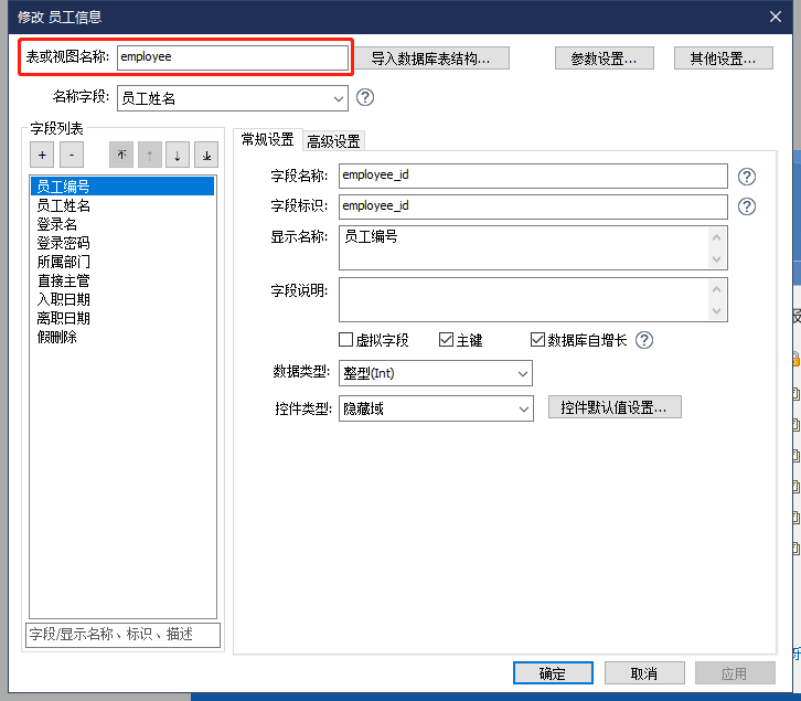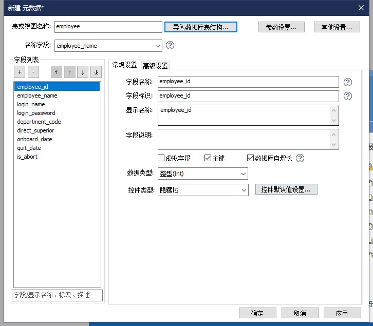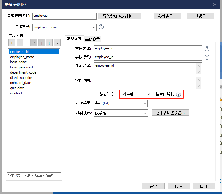 在本实例中,employee.employee_id 本身是数据库表主键,所以导入的时候会自动勾选为【主键】项。此外,系统会为主键字段默认设置为“隐藏域”的控件类型,因为主键若是自动生成 的在一般情况下将作为不需要编辑的字段,不会展示给填表用户。