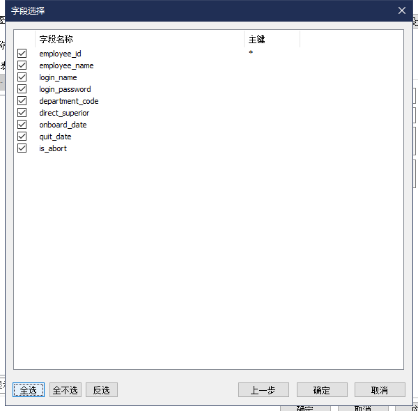 进入“字段选择”界面,列表自动获取所选数据表的字段信息。