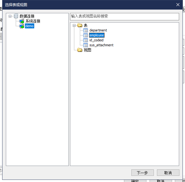 出现如下对话框,选择数据连接后可以自动获取到当前数据连接下的数据表和数据视图,例如我们选择提前准备好的员工信息表“employee”,单击【下一步】。