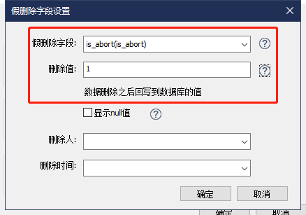在案例中,我们假设需要保留删除的已离职员工信息,需要实现假删。如下图所示,我们可以在此配置假删除字段为建表时预设的is_abort字段,并定义删除值为1,表示当表单使用当前元数据进行删除操作时会将被删除记录的is_abort字段赋值为1,且当is_abort字段为1时,该记录就处于假删除状态。