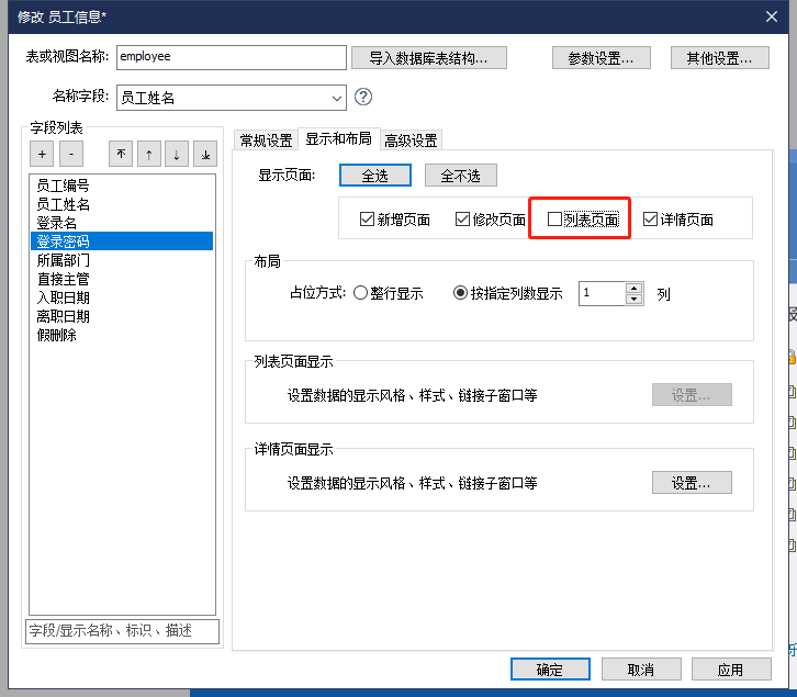 在本案例中,例如“登录密码”字段不希望在列表中出现,就将【列表页面】取消勾选,那么“登录密码”字段就只会在新增、修改、详情页面显示,而不会在列表页面显示了。