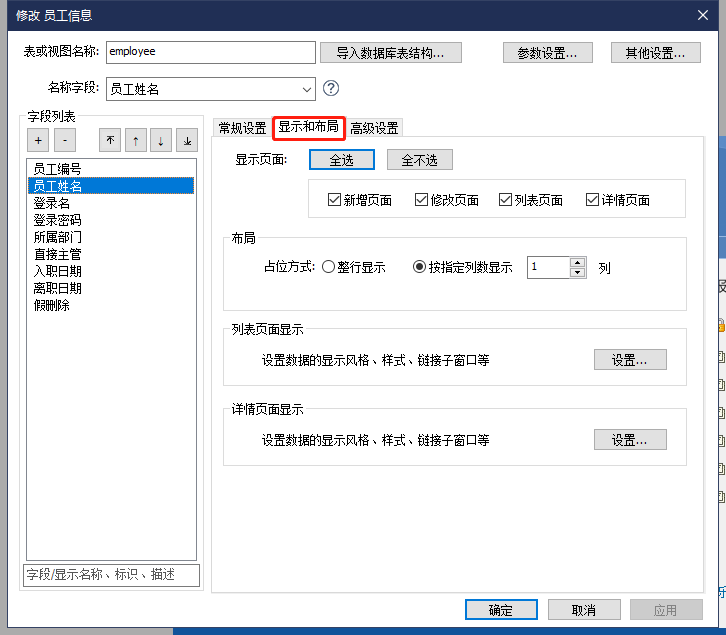 配置完字段的【常规设置】后,可以在【显示与布局】一栏中,根据业务需要对字段的显示页面、页面布局、列表和详情页面的显示样式等进行配置,如下图所示。