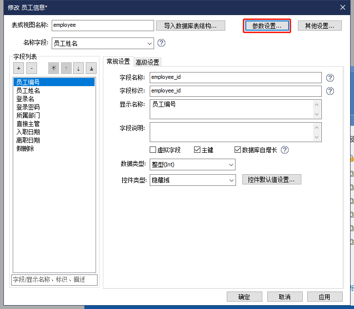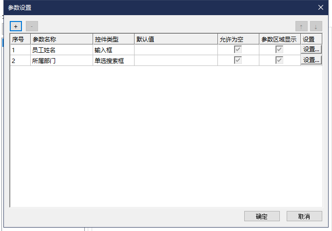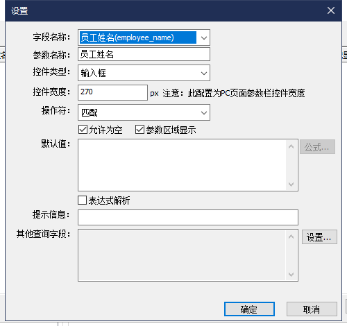 本例中例如我们需要对员工信息的“员工姓名”和“所属部门”进行查询,就可以设置这两个字段作为参数。“员工姓名”设置输入框进行模糊匹配查询,“所属部门”设置为单选搜索框进行选项查询,如下图。