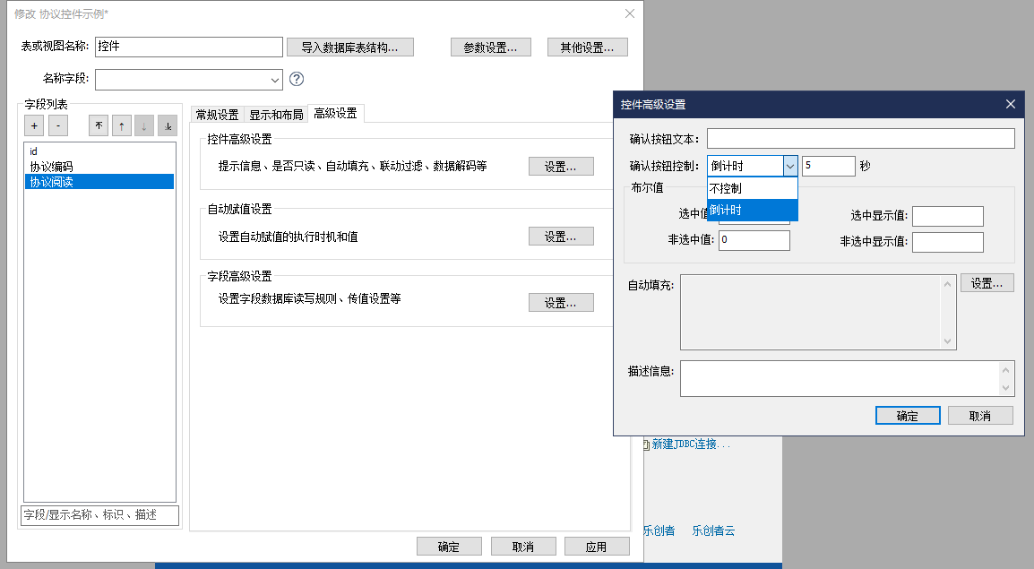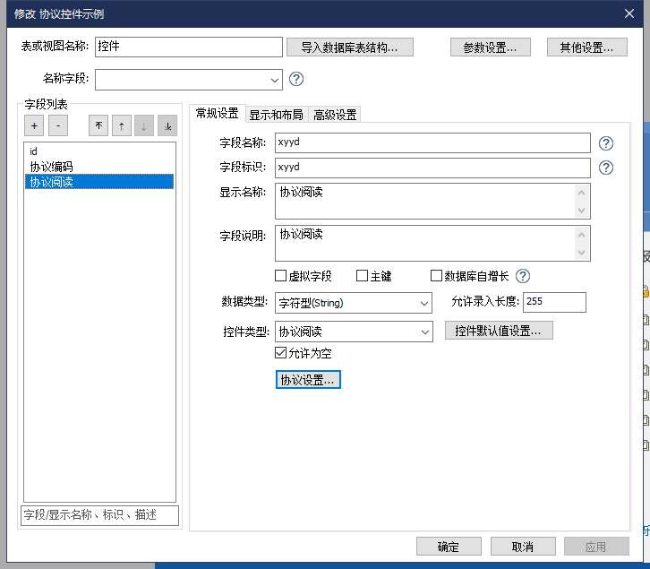 - 协议设置:可以在打开的弹窗中设置控件在编辑页面和详情页面的显示内容。