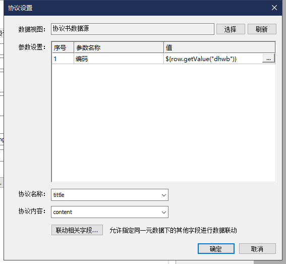 - 若数据视图有参数,可以通过参数设置指定协议标题和内容的取值,如示例中我们将协议编码作为参数,希望协议内容的展示可以根据另一个字段的值变化而变化