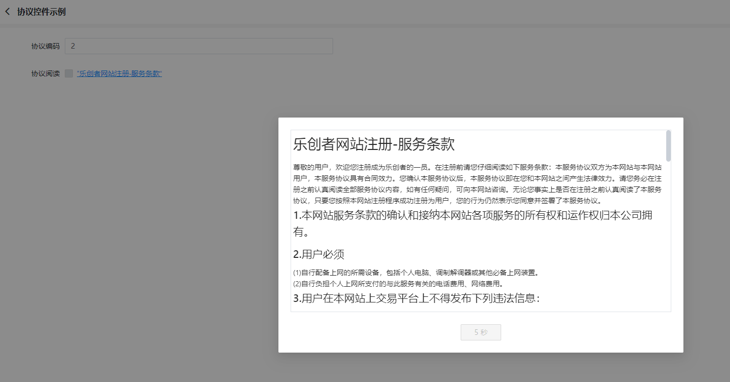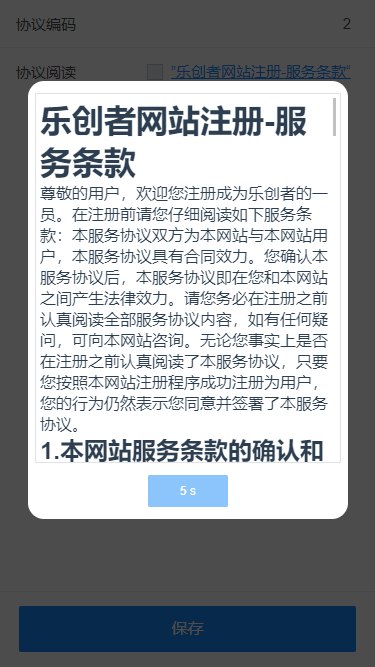 例如我们现在需要实现一个业务实例:当协议未被阅读时表单无法提交保存,且协议内容页面需保持5秒后才支持关闭。