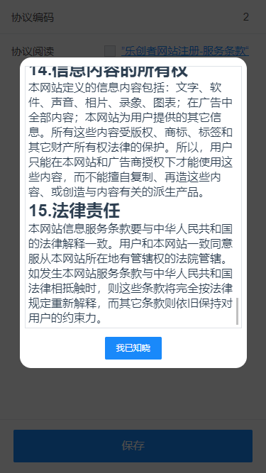 - 确认按钮文本:默认为空,不配置时前端显示为“我已知晓”
