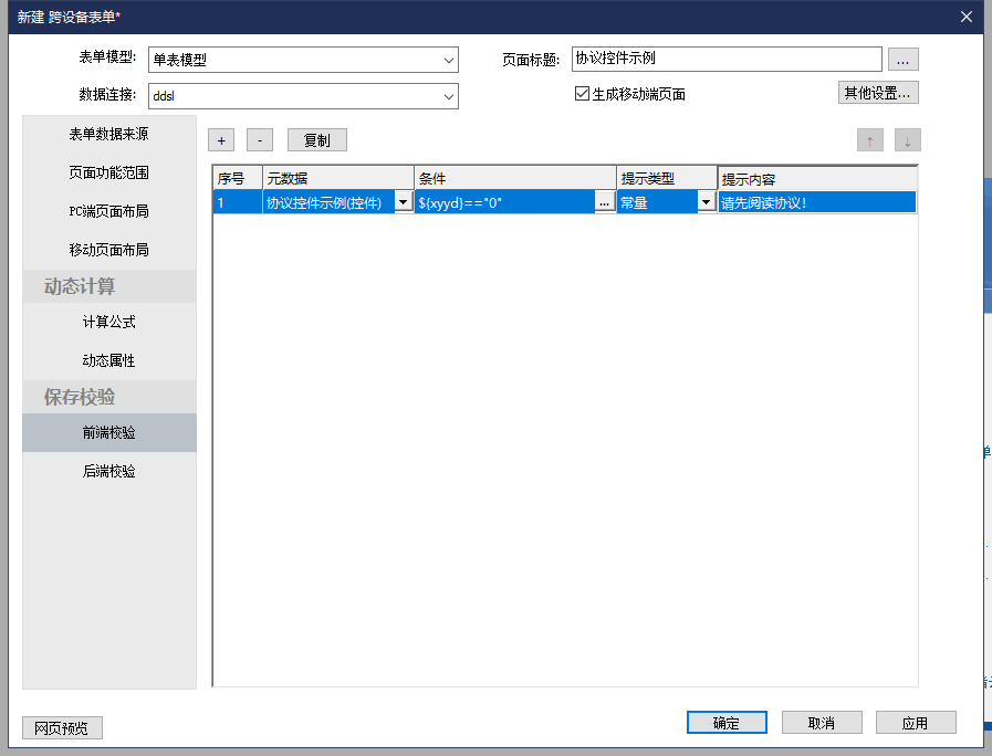 创建一个最基础的单表模型,按实例场景要求“当协议未被阅读时表单无法提交保存”,那么就需要将协议字段的选中作为提交保存的校验条件,如下图。