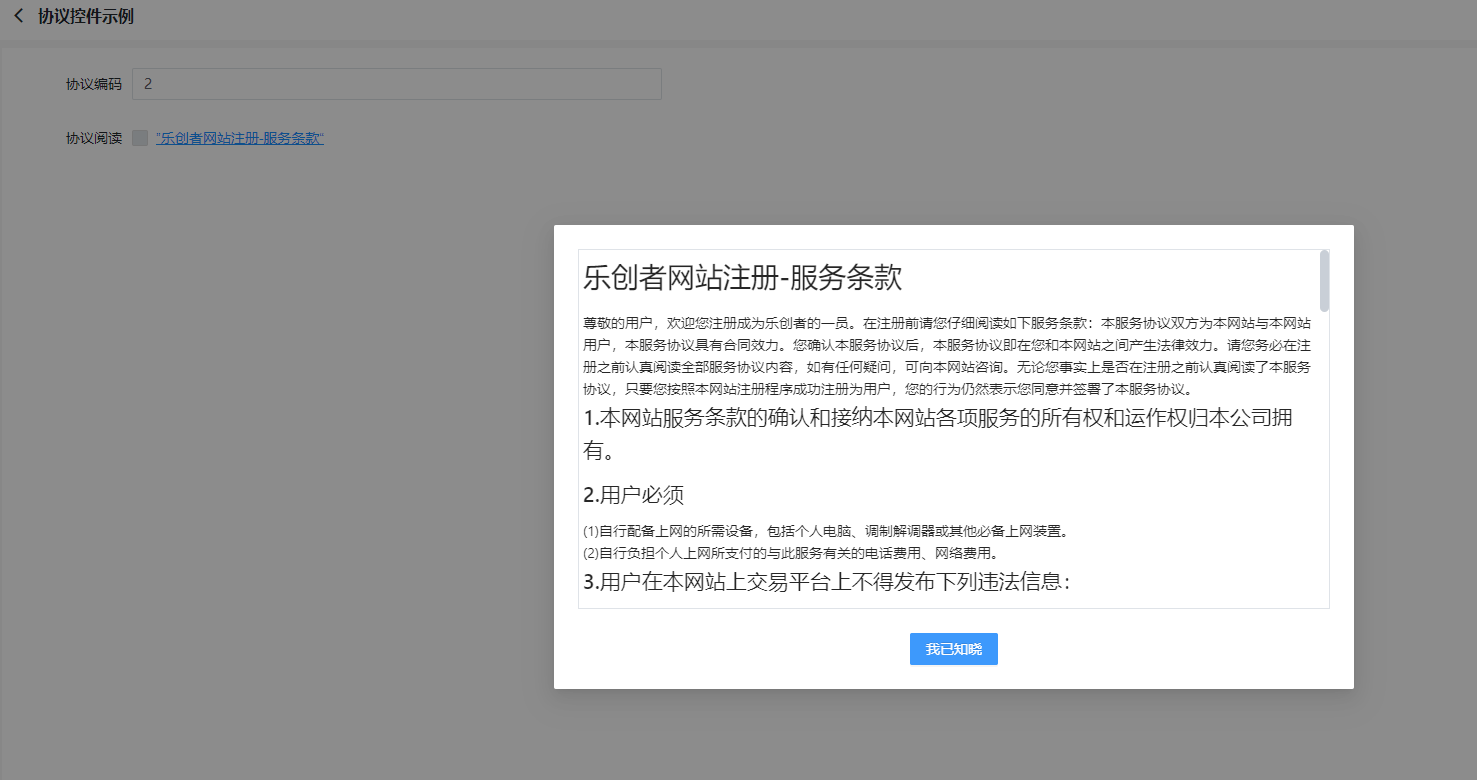 该控件用于特定的业务场景下,需要对某个文本内容进行阅读确认后,才能进行下一步操作,例如需要阅读诚信承诺书以后才能提交表单数据。