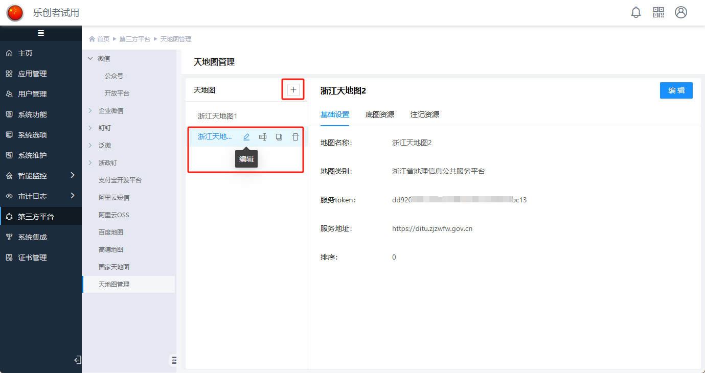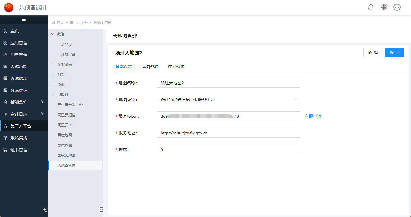 基础设置中是地图资源的关键性配置,主要配置有【地图名称】和【服务token】等,因为目前地图类别及支持仅支持“浙江省地理信息公共服务平台(浙江天地图)”,故【地图类别】不需要修改,【服务地址】也自动填入了 “https://ditu.zjzwfw.gov.cn” 不需要修改。服务token的申请方式可以查阅 浙江省地理信息公共服务平台-开发中心