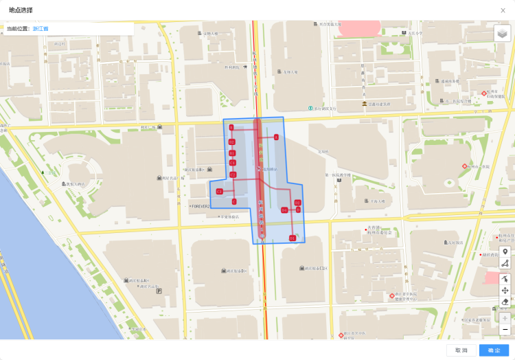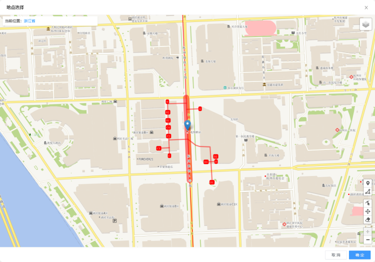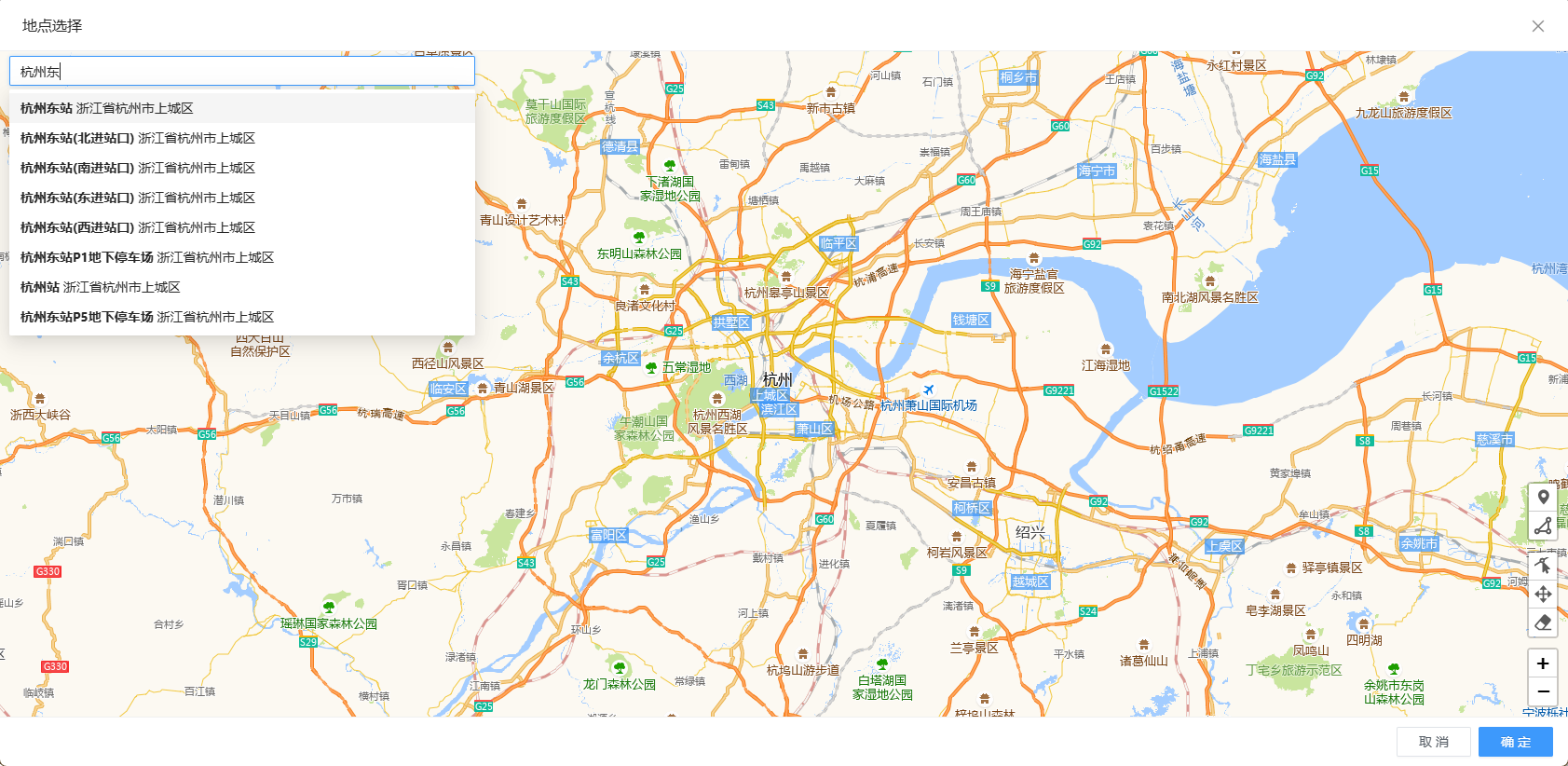- 地点定位功能:根据配置的地图资源能力开放一定搜索功能,方便选择地点时进行范围过滤。目前浙江天地图仅能做到行政区划过滤,不能进行精确查找;高德地图则支持详细地点的搜索和定位。