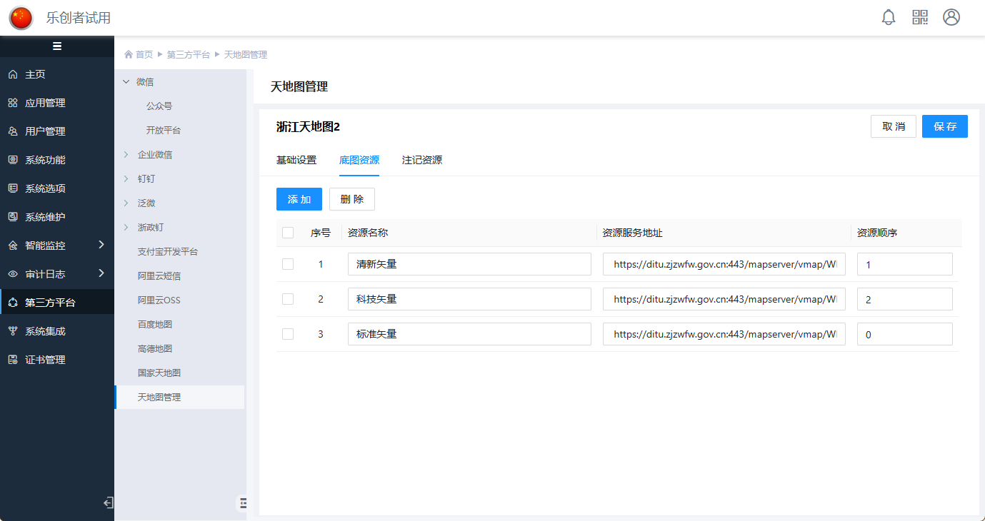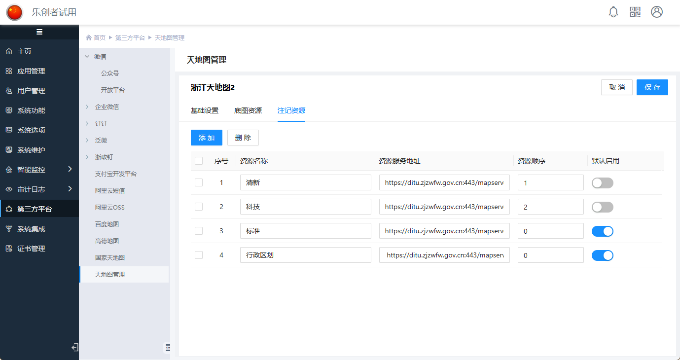 添加天地图资源,如下图所示。可以在此列表进行天地图资源的新增、编辑、删除。