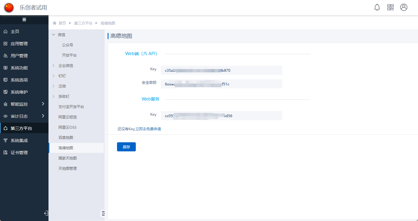 以上两种平台的地图资源需要在门户登录系统管理员账号,在管理后台“第三方平台”中分别进行配置。