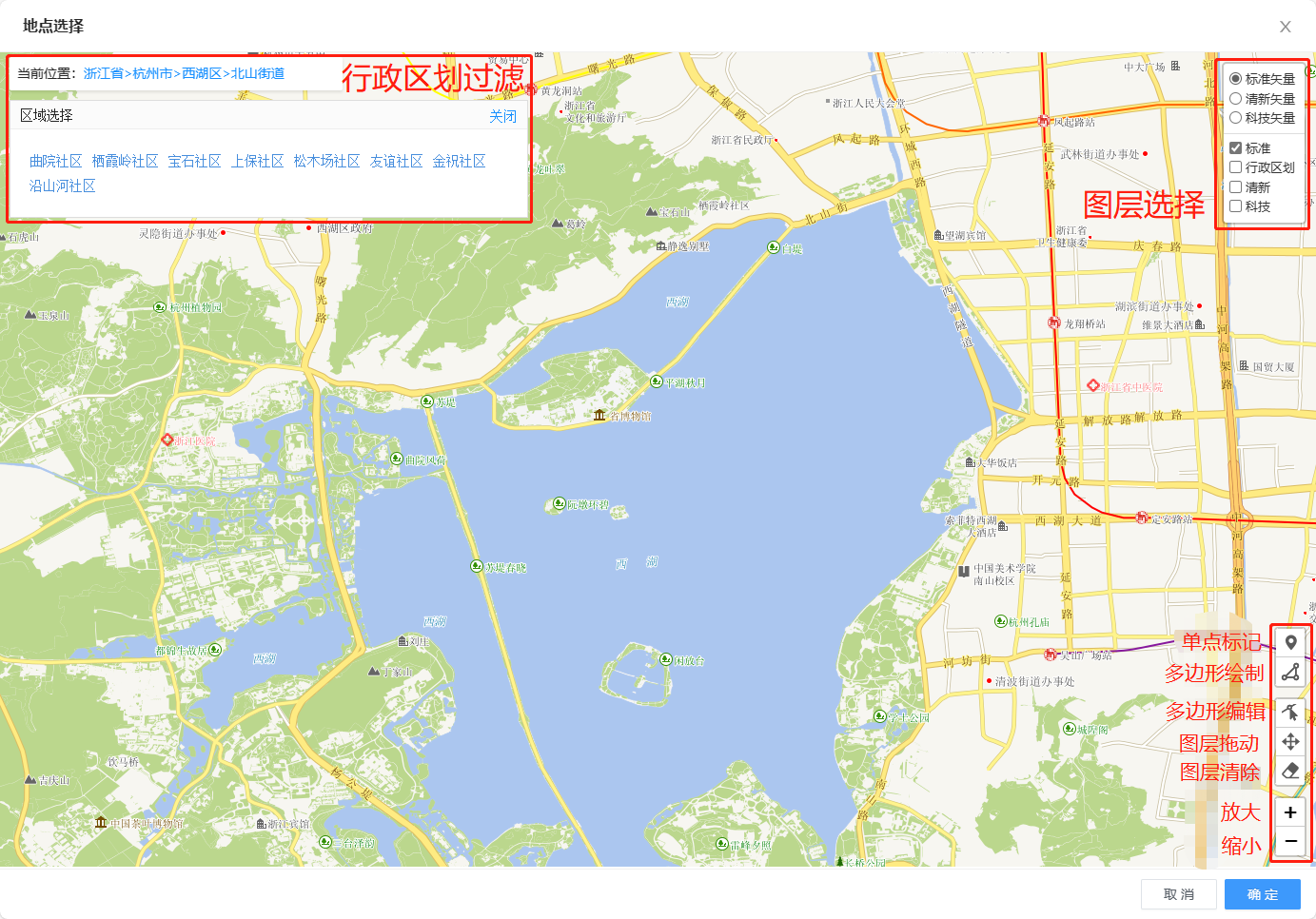- 图层选择:仅浙江天地图支持切换图层,此处显示的图层当前选择的地图资源中的底图资源和注记资源,在地点选择界面可以由用户自行切换地图的显示图层。