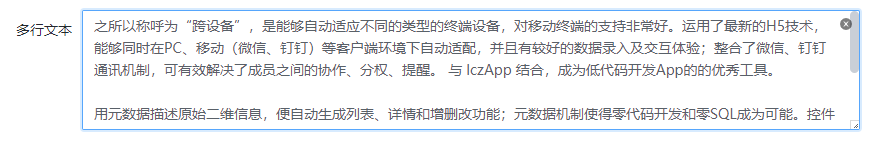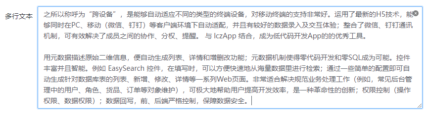 多行文本同样作为输入控件,不同于单行文本的是,多行文本可以展示多行内容,一般适用于需要往字段中输入较多文字的场景,多行显示可以方便在编辑页面对大段内容的查看和编辑。