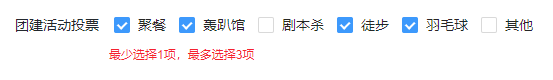 - 多选数目限制:默认不勾选,即不限制勾选项数量。勾选后允许配置最少选几项和最多选几项,在填报时限制该字段的勾选数目,不符合要求时表单无法保存并提示。