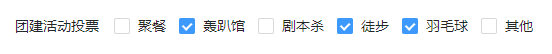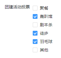 下拉复选框组控件适用于在数量较少的有限选项中一次性选择多个选项,例如兴趣爱好选择、团建活动投票等场景。使用此类控件的优点在于当选项数量不多时可以列出所有选项,让填报用户选择起来更加直观。