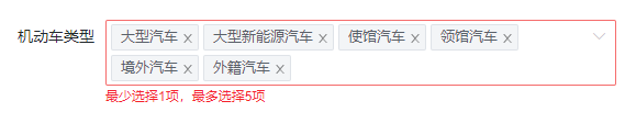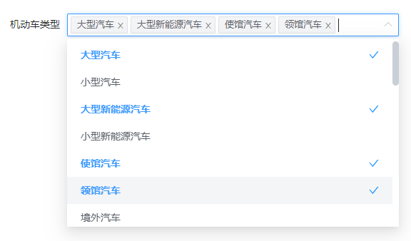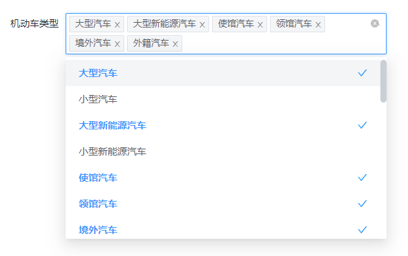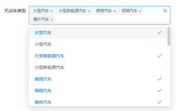 下拉复选框控件适用于从多个下拉选项中一次性选择其中多项,例如机动车类型选择、巡检问题记录、人员选择等,控件支持数据联动,支持选项搜索功能。