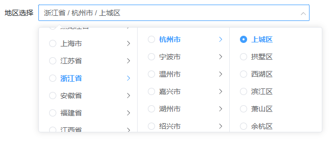 单选级联控件一般用于树形数据例如省市区、组织架构等的单选,支持从级联方式展示的数据中选择其中一项,只能使用EasySearch树形结构数据源,支持通过关键字搜索来查找选项。