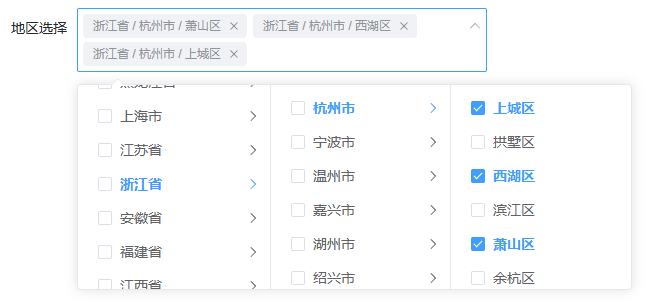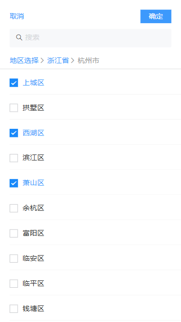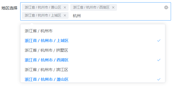 多选级联控件一般用于树形数据例如省市区、组织架构等的多选,支持从级联方式展示的数据中选择多个选项,只能使用EasySearch树形结构数据源,支持通过关键字搜索来查找选项。