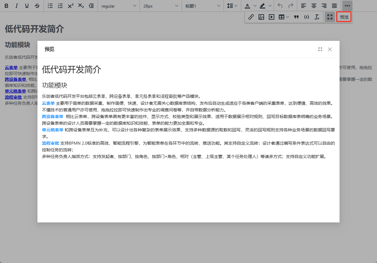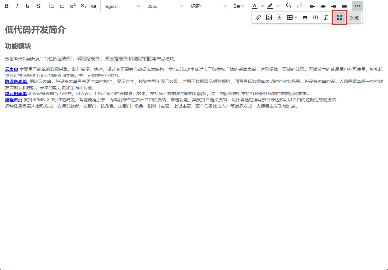版本V7.3.0:工具栏字体扩充新增仿宋_GB2312、方正小标宋简体等;工具栏扩充行高调整、插入表格功能;支持全屏编辑;支持预览功能。