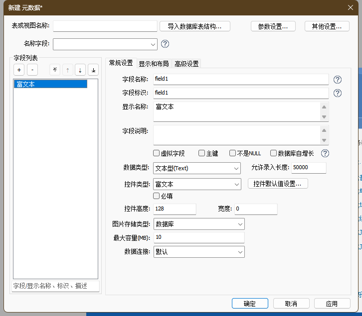 - 富文本控件默认整行显示,详细配置说明请查阅章节 元数据>字段显示与布局
