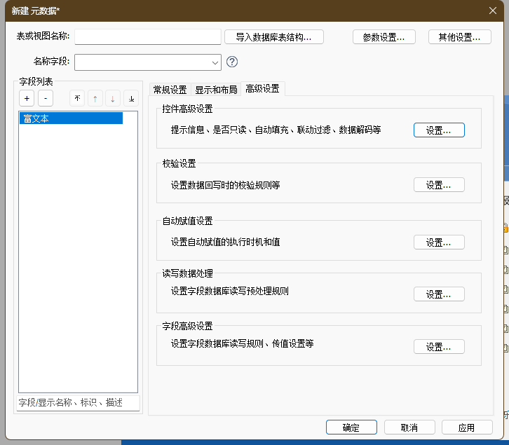 - 支持控件高级设置、校验设置、自动赋值设置和字段高级设置等,详细配置说明请查阅章节 元数据>字段高级设置