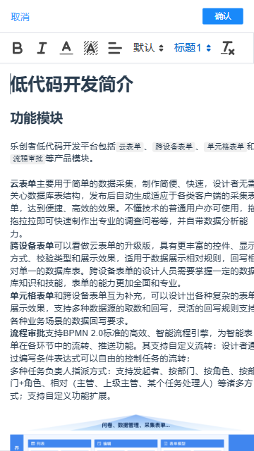 - 填报样式:支持的工具栏功能相比PC端控件较少,只能满足简单的富文本编辑场景。