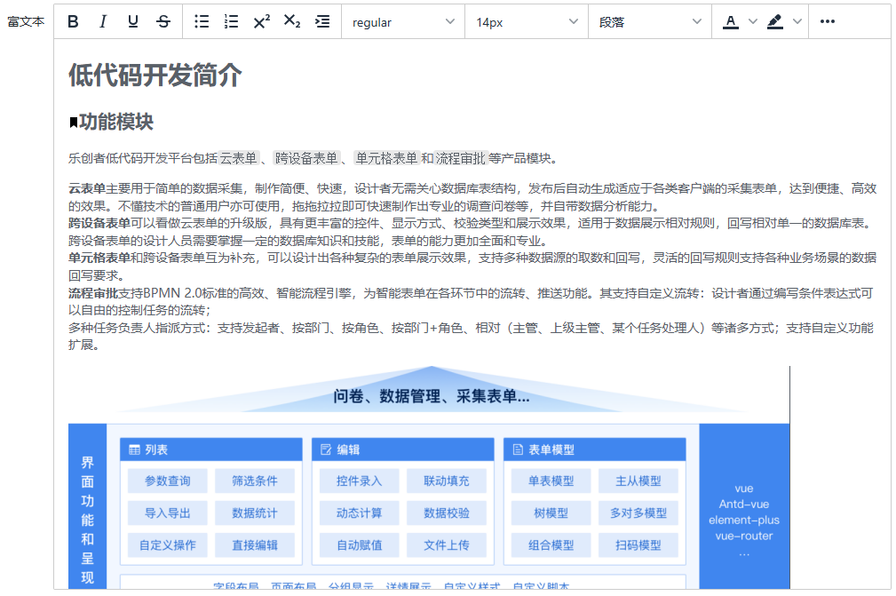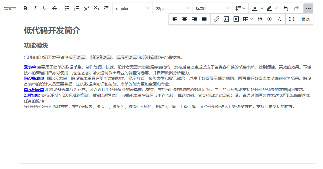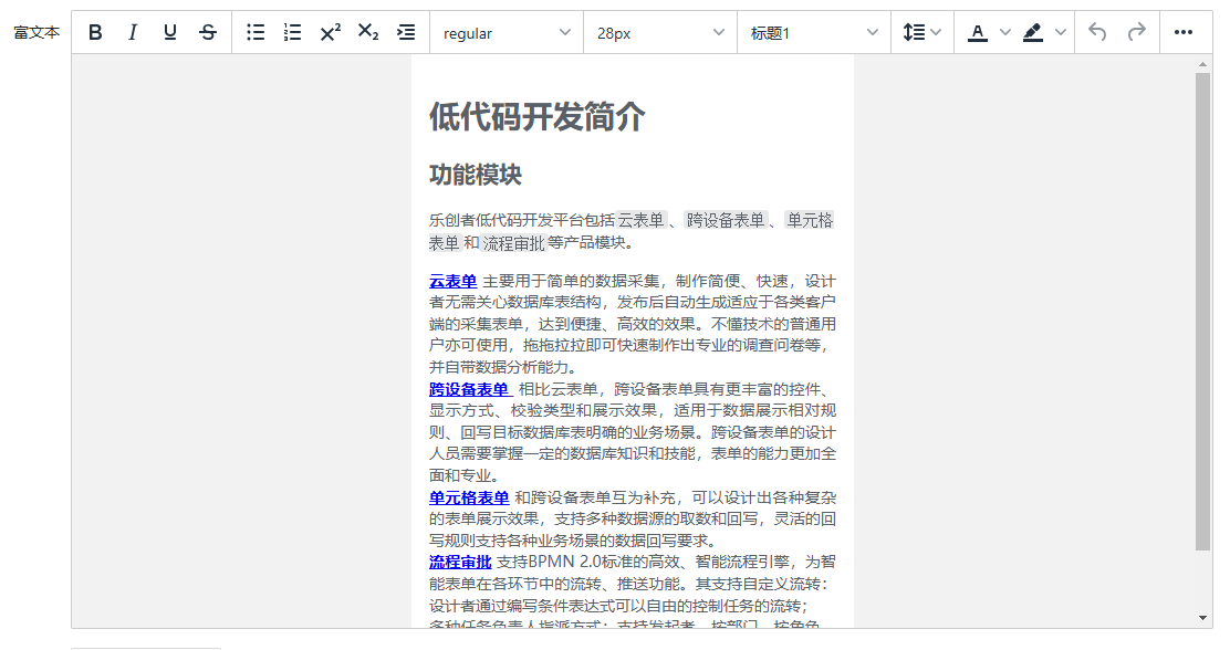 富文本控件一般用于在表单填报时需要通过富文本编辑或展示的数据,例如文章、通知、新闻稿等。
