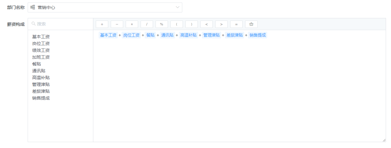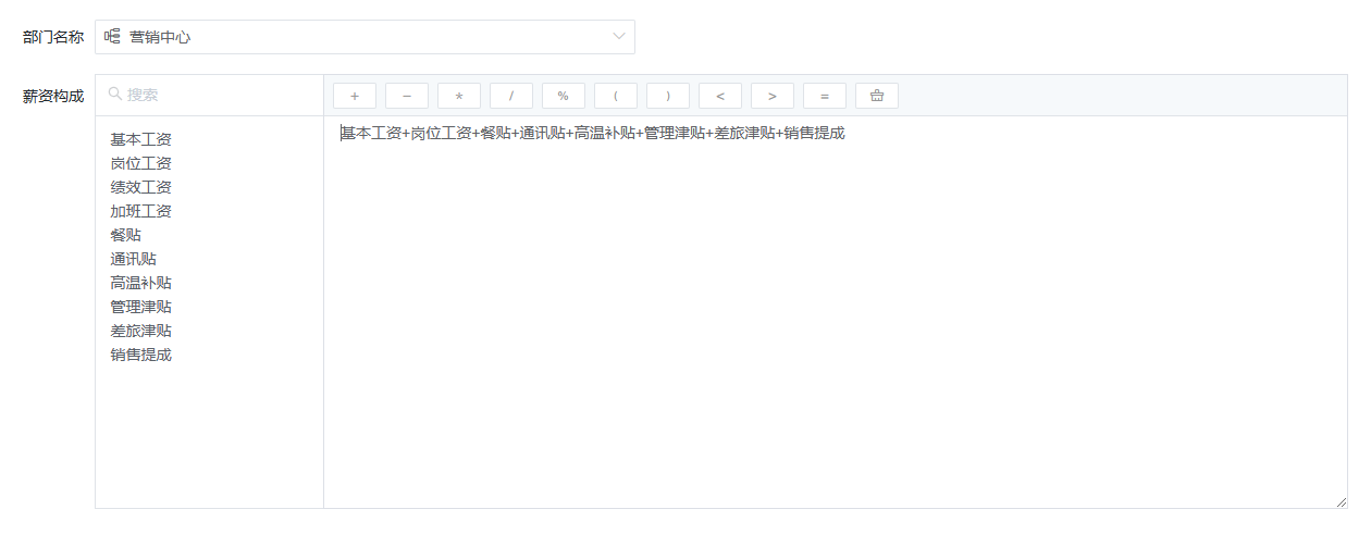公式编辑控件可以看做一个应用于特定的业务场景下的多行文本输入框,带有选项和计算工具栏,可以对一些业务规则进行公式编辑,例如员工薪资构成计算方式。