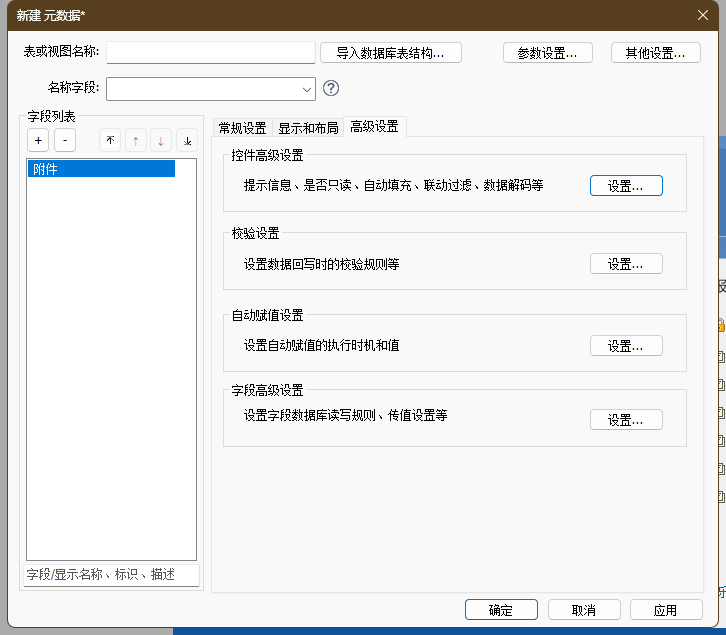 - 支持控件高级设置、校验设置、自动赋值设置和字段高级设置等,详细配置说明请查阅章节 元数据>字段高级设置
