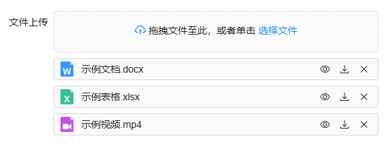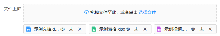 文件上传控件一般用于在表单填报时需要上传附件的场景。可以通过配置来进行控制控件的文件上传个数、文件上传格式、单个文件最大容量、文件存储介质等。