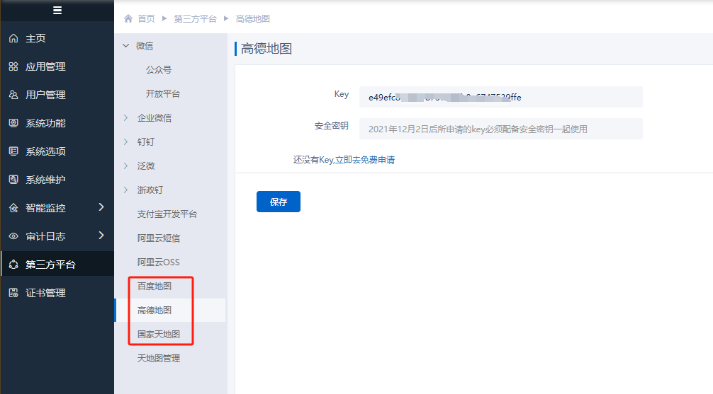 2) 在乐创者管理后台的“第三方平台”页面中,配置对应使用的地图资源配置,目前定位控件支持高德地图、百度地图、国家天地图,如果没有对应的配置,定位界面地图会显示为空白。